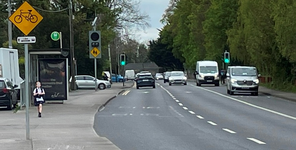 Lucan Road's alignment leaves over 11.5m from the carriageway kerb, at the deepest setback distance to the property boundaries. This forms a shared surface for access to private driveways, pedestrians and informal visitor parking. Cycling is indicated within the vehicular carriageway. This wide paved area, with a Dublin Bus stop shelter, has potential as public realm to bring coherence to the mix of uses and activities.